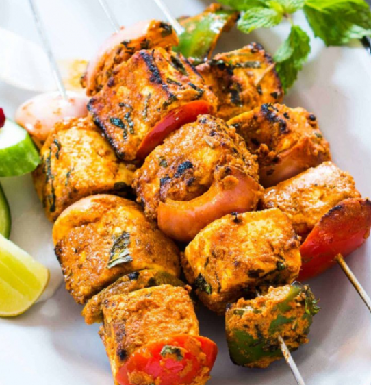 Red Tomato sauce, Ginger, Onions, Green Peppers, Olives, Pineapple, Tomatoes, Marinated with Spices & Shahi Paneer Sauce, Mozzarella Cheese