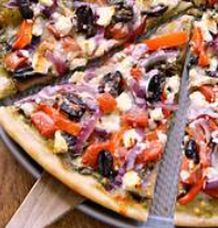 Red Tomato Sauce, Roasted Garlic, Onions, Spinach, Feta Cheese, Banana Peppers, Mozzarella Cheese, Tomatoes & Pesto Sauce.